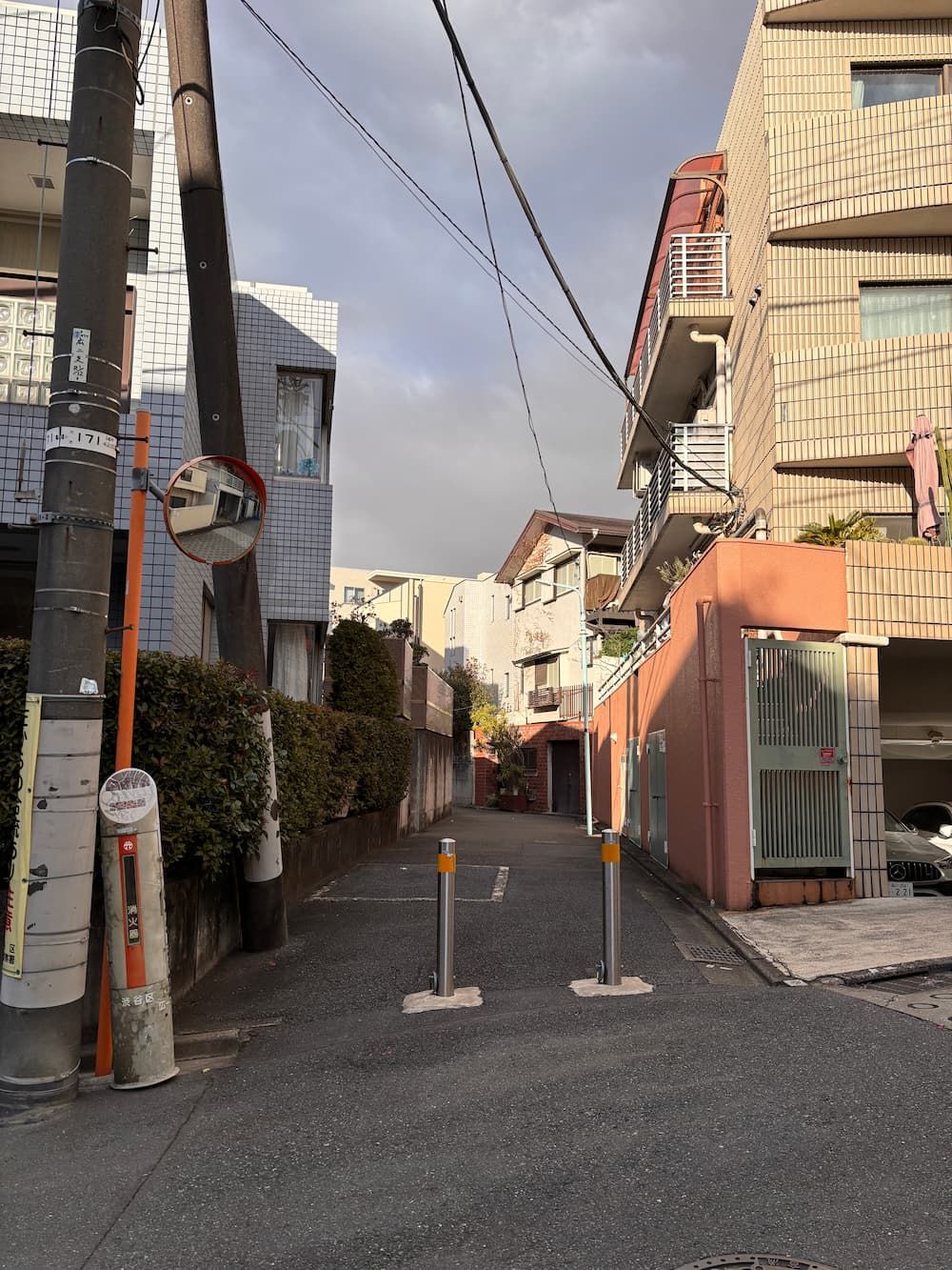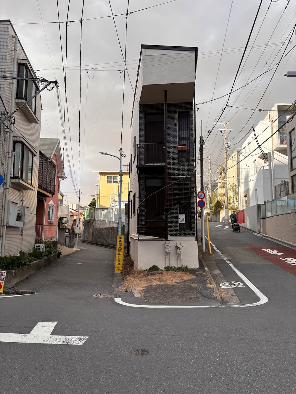 The building at the Y-shaped junction appears strikingly narrow, squeezed into the tight space.